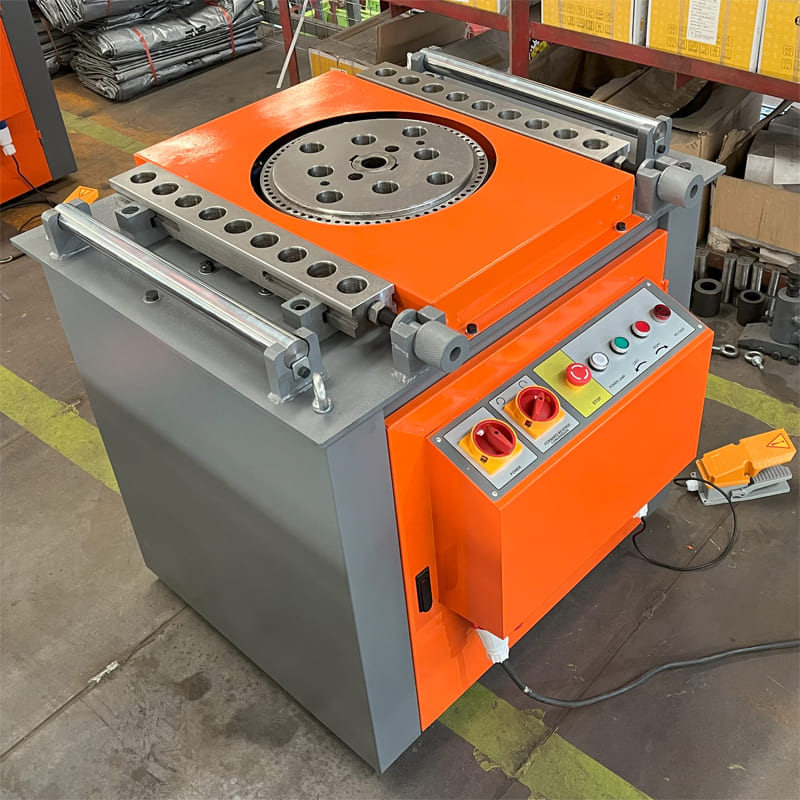GW42D Rebar Bending Machine operates using a horizontal working disc that rotates around a vertical axis. Initially, steel bars are placed on the disc and secured with a supporting pin. The machine is equipped with both a center pin and a bending pin mounted on the disc. As the disc rotates, it bends the steel bar into the desired shape. The working disc has multiple holes for inserting bending pins, allowing for easy adjustments to accommodate various bar diameters by simply swapping out the center pins.